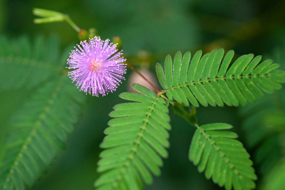 ¡Qué planta tan increíble! Espero que hayas tenido la oportunidad de tocar las delicadas hojas de la mimosa púdica. En cuanto las tocas, comienzan a cerrarse como si fueran manos que se juntan. En realidad, es una forma en que la planta se protege, y por eso se le dio el nombre de mimosa púdica. Sus flores parecen pequeños fuegos artificiales violetas, ¡casi como un satélite que recibe las vibraciones del universo! ella es muy sensible al tacto. Las hojas se cierran por la noche y se vuelven a abrir al amanecer, así como cada vez que se tocan.